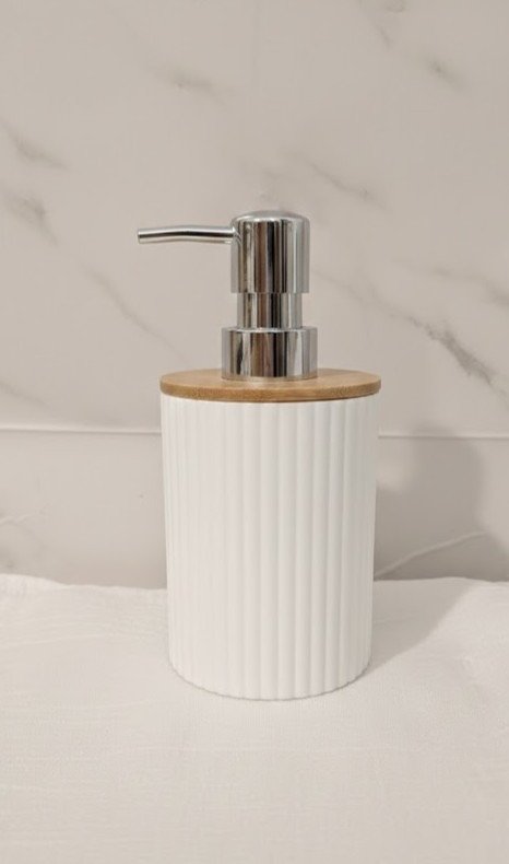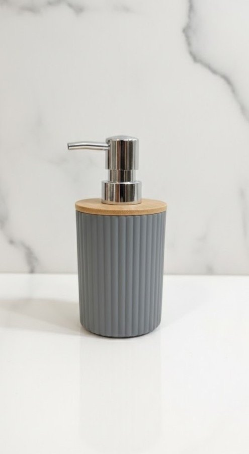 Dispenser de jabón liquido con cabezal plástico cromado y tapa de bambú