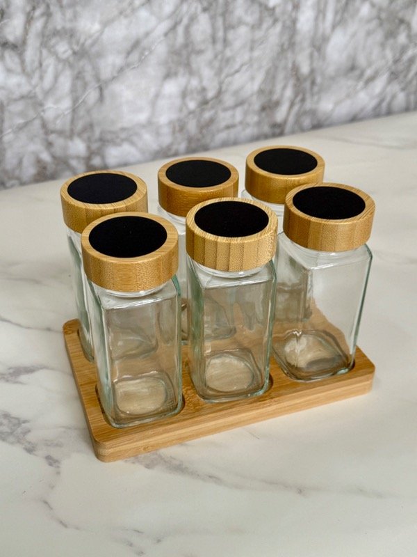 El set incluye 6 frasquitos y la base de bambú