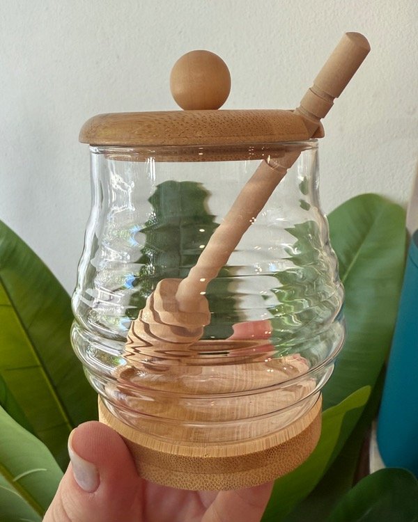 Mielera de vidrio con untador, base y tapa de madera 300cc