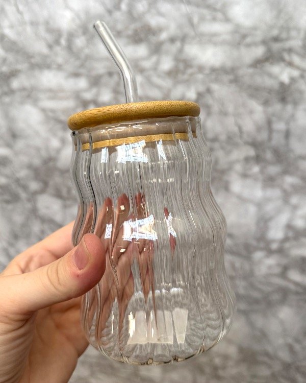 VASO DE VIDRIO CON TAPA Y SORBETE ONDAS